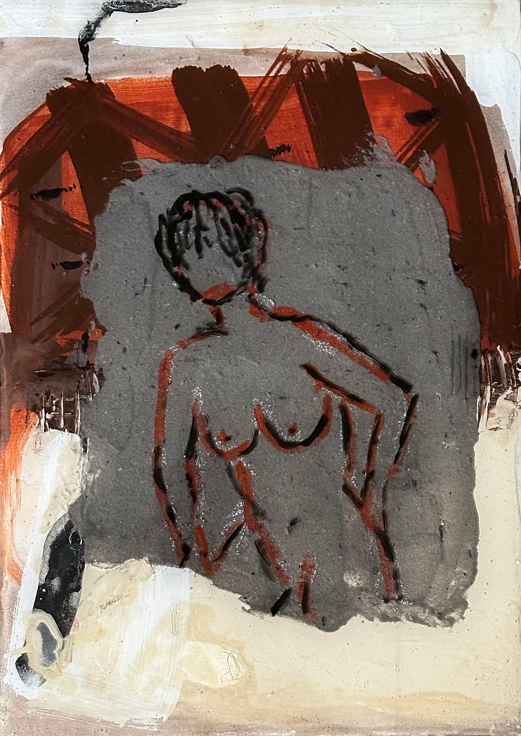 Die Andeutung eines Aktes bleibt fragmentarisch, beinahe schemenhaft. Linien, Farbschleier und leichte Strukturen schaffen Raum für Assoziation, nicht für Definition. Die Farbpalette bleibt zurückhaltend – helle Naturtöne, zarte Grau- und Rosénuancen –, wodurch sich eine innere Ruhe und fast schon kontemplative Tiefe entwickelt.