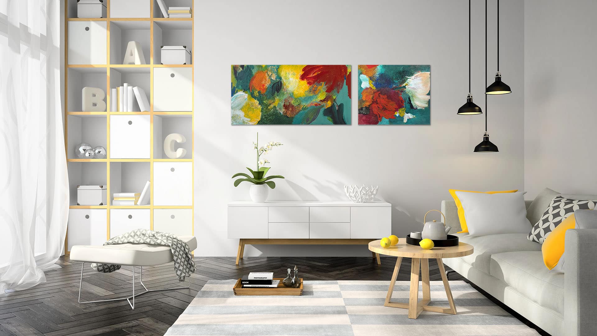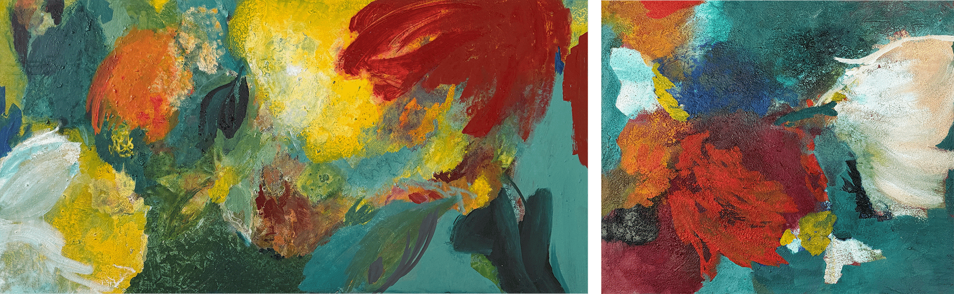 Die Komposition besteht aus zwei nebeneinander gehängten Formaten (50cm x 100cm und 50cm x 60cm), die zusammen eine lebendige Einheit bilden. In beiden Teilen entfalten sich farbintensive, blütenartige Formen, die jedoch nicht klar definiert sind, sondern sich in freien, dynamischen Pinselbewegungen auflösen.