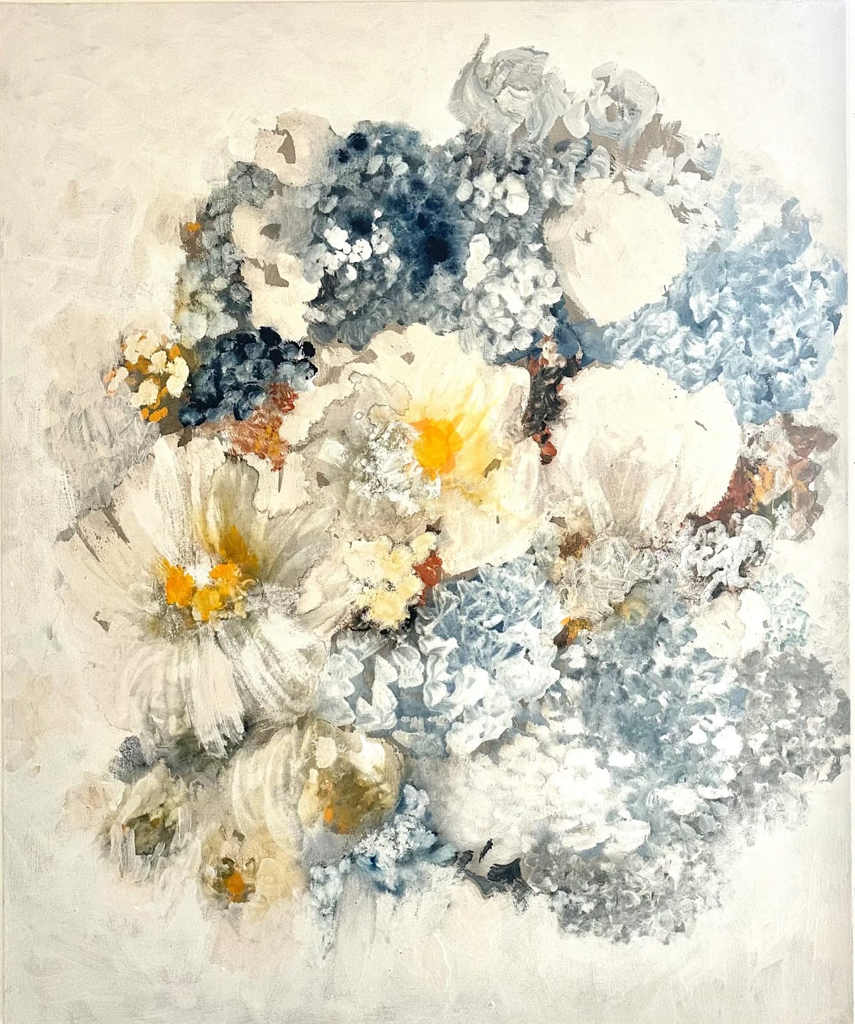 Das Werk Blumen unter sich II beeindruckt durch eine sanfte, beinahe träumerische Bildsprache, die florale Assoziationen weckt, ohne sich an konkrete Formen zu binden. Auf einer großzügigen Leinwand von 120 x 100 cm entfalten sich fein nuancierte Pigment- und Acrylschichten, die eine lebendige, doch ausgewogene Farbstimmung erzeugen.