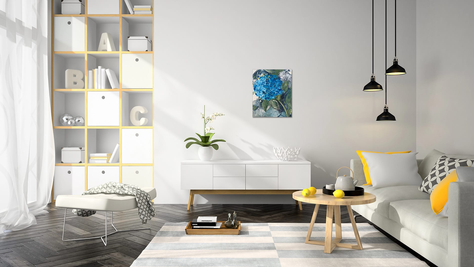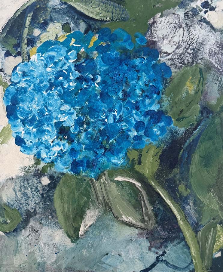 Im Zentrum steht eine üppige, blau leuchtende Blüte, die an eine Hortensie erinnert. Die einzelnen Blütenelemente sind in dichten, pastosen Pinselbewegungen aufgebaut, wodurch eine plastische, fast greifbare Struktur entsteht. Unterschiedliche Blauabstufungen – von hell bis tief – verleihen der Blüte Tiefe und Dynamik.