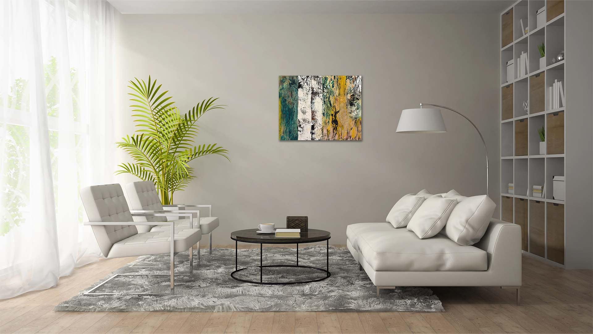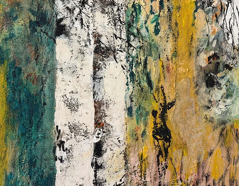 Das Bild ist geprägt von vertikalen Strukturen, die an Baumstämme oder Lichtschneisen erinnern und dem Werk eine klare, aufrechte Gliederung geben. Besonders auffällig ist die helle, fast weissliche Mittelzone, die sich wie ein Lichtkanal durch die Komposition zieht. Sie wirkt ruhig und zugleich kraftvoll und bildet einen starken Kontrast zu den umgebenden Farbfeldern.