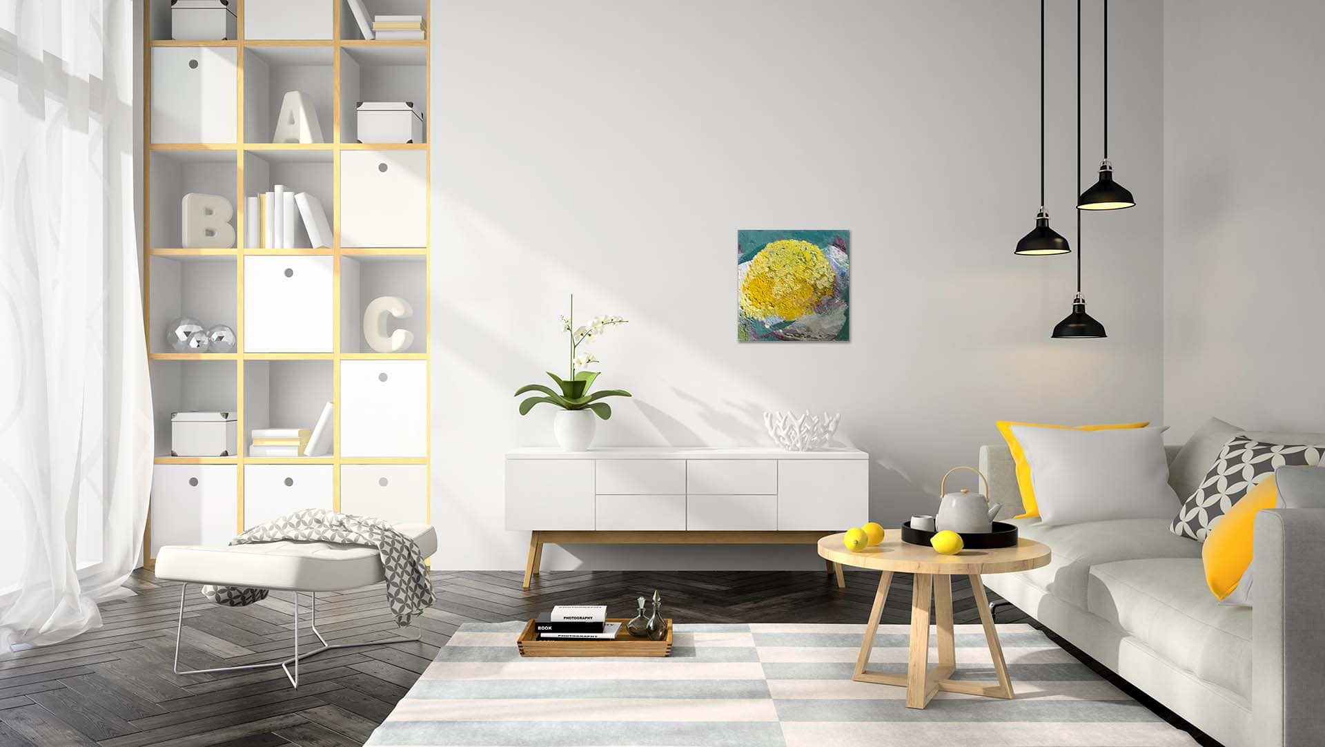 Im Zentrum steht eine intensiv leuchtende, gelbe Form, die an eine Blüte oder eine von Sonnenlicht erfüllte Fläche erinnert. Die Pigmente sind dick und pastos aufgetragen, wodurch eine stark strukturierte, fast reliefartige Oberfläche entsteht. Die unregelmässige, körnige Textur lässt das Licht unterschiedlich reflektieren und verleiht dem Gelb eine besondere Tiefe.