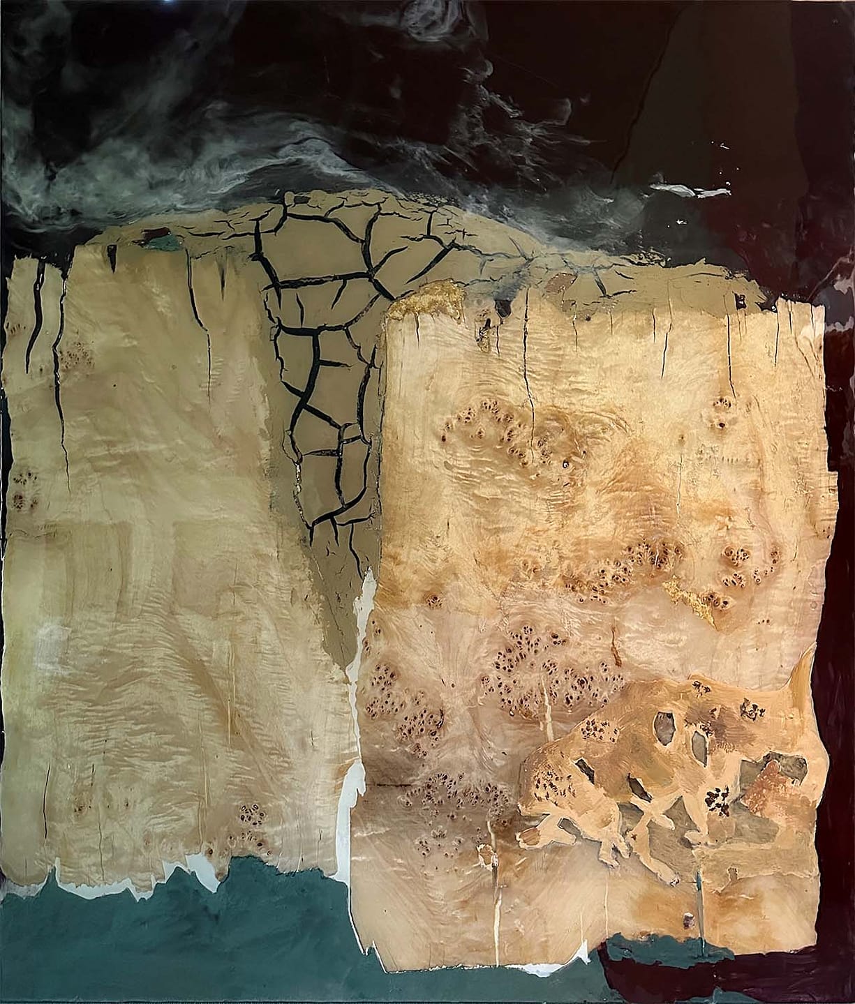 Auf Holz gearbeitet und mit Pigment, Acryl und Resin gestaltet, entfaltet die Komposition eine eindrucksvolle Tiefe. Im Vordergrund stehen zwei helle, fast reliefartige Flächen, die an bearbeitetes oder erodiertes Gestein erinnern. Natürliche Strukturen, Risse und feine Maserungen ziehen sich über die Oberfläche, wodurch ein lebendiges Spiel aus organischen Mustern entsteht.