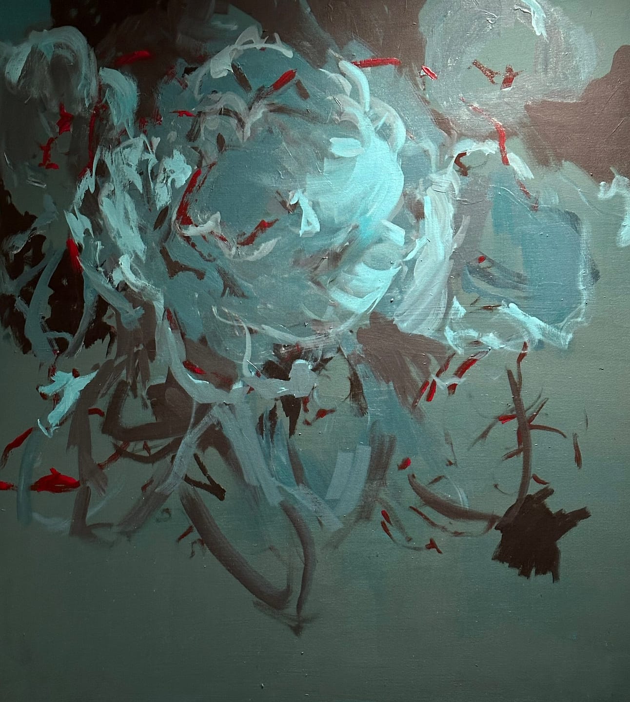 Mit Wolkenweben II erschafft Heidi Jerger eine eindrucksvolle, fast traumhafte Szenerie auf 100 x 100 cm Leinwand. Sanfte Schichten von Weiß, Blau, Grün und erdigen Tönen verschmelzen zu einer Komposition, die an zarte Wolkenformationen erinnert. Der pastose Auftrag von Pigmenten und Acryl verleiht dem Bild eine spürbare Struktur – wie fein gewebte Fäden aus Licht und Farbe.