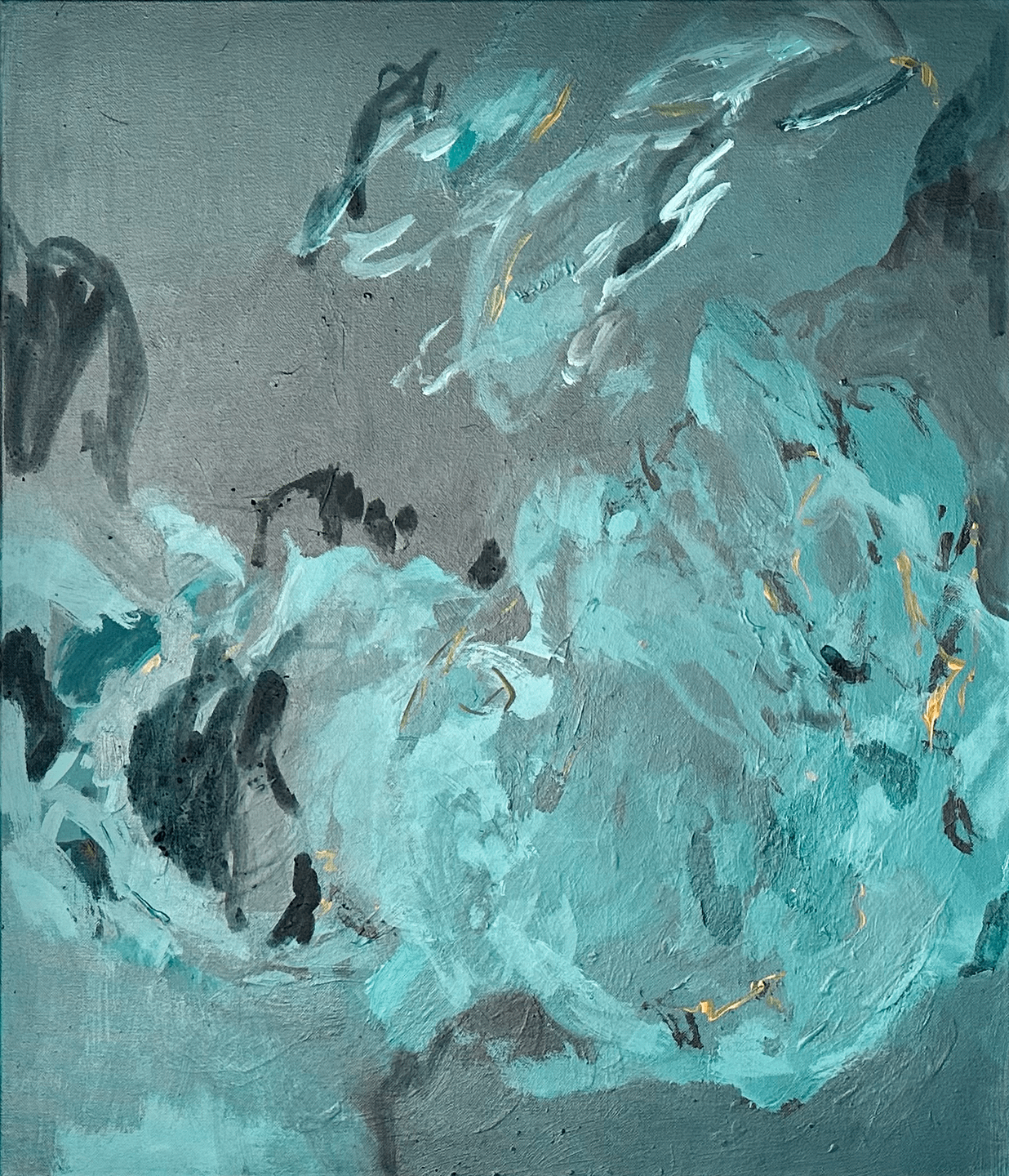 Zarte Grau-, Weiß- und Cremetöne überlagern sich in weichen Übergängen und durchscheinenden Schichten. Wie feine Schleier scheinen die Farbschichten über die Leinwand zu gleiten, als würden sich Wolken am Horizont verweben, lösen und neu formieren. Die abstrahierte Darstellung bleibt bewusst offen, bewegt sich zwischen Landschaft und Emotion.